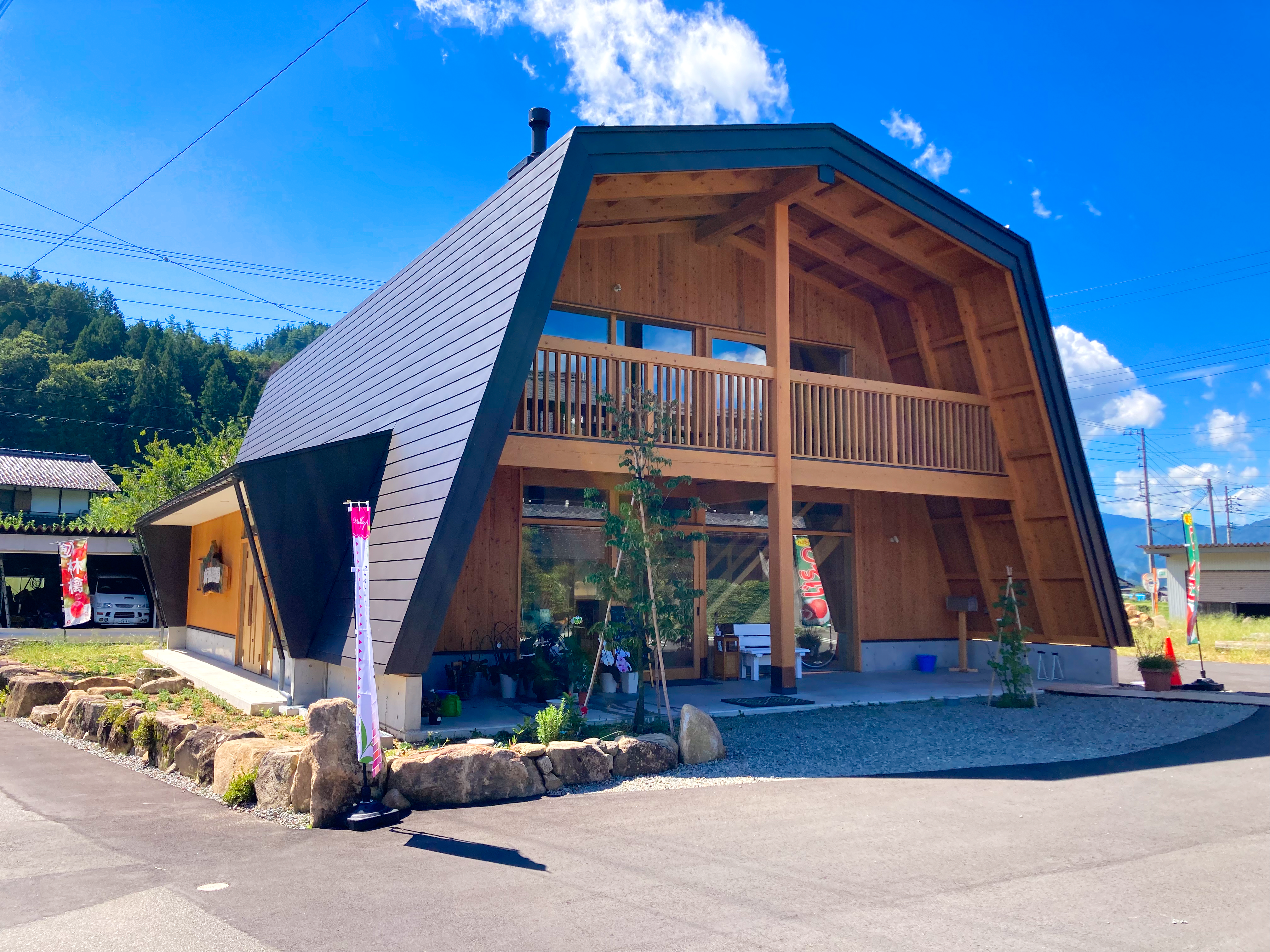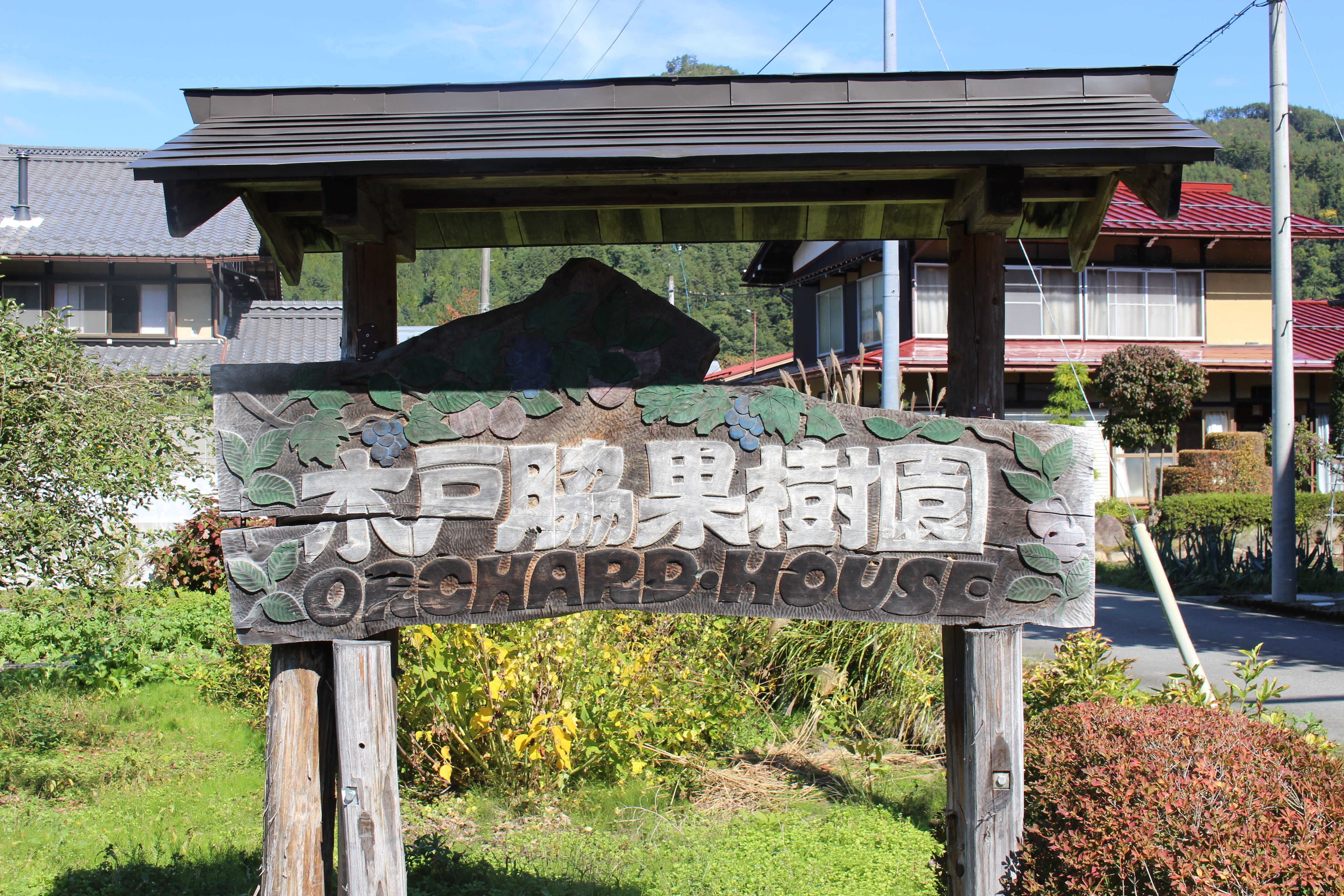 木戸脇果樹園 ORCHARD HOUSEの手彫り看板を掲げる。